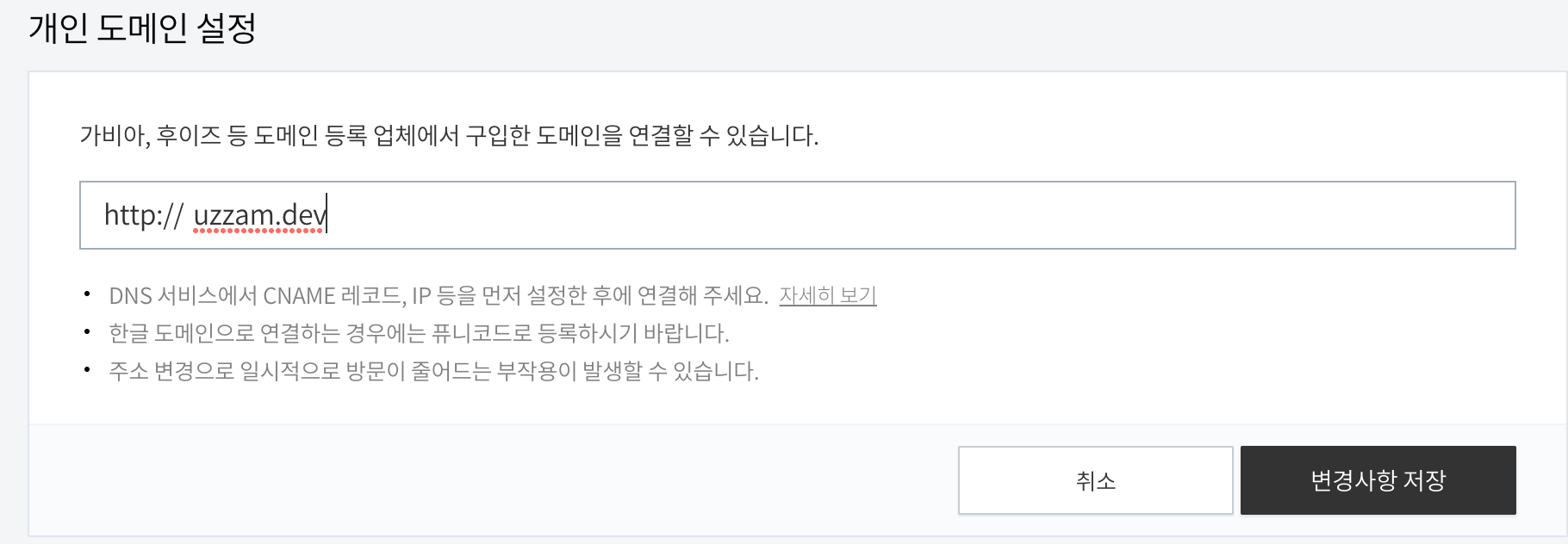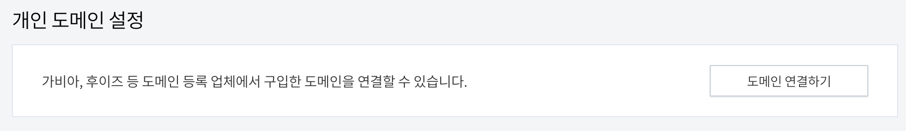 2. 개인 도메인 설정 부분에서 '도메인 연결하기'를 누르고 본인의 도메인을 입력한다.