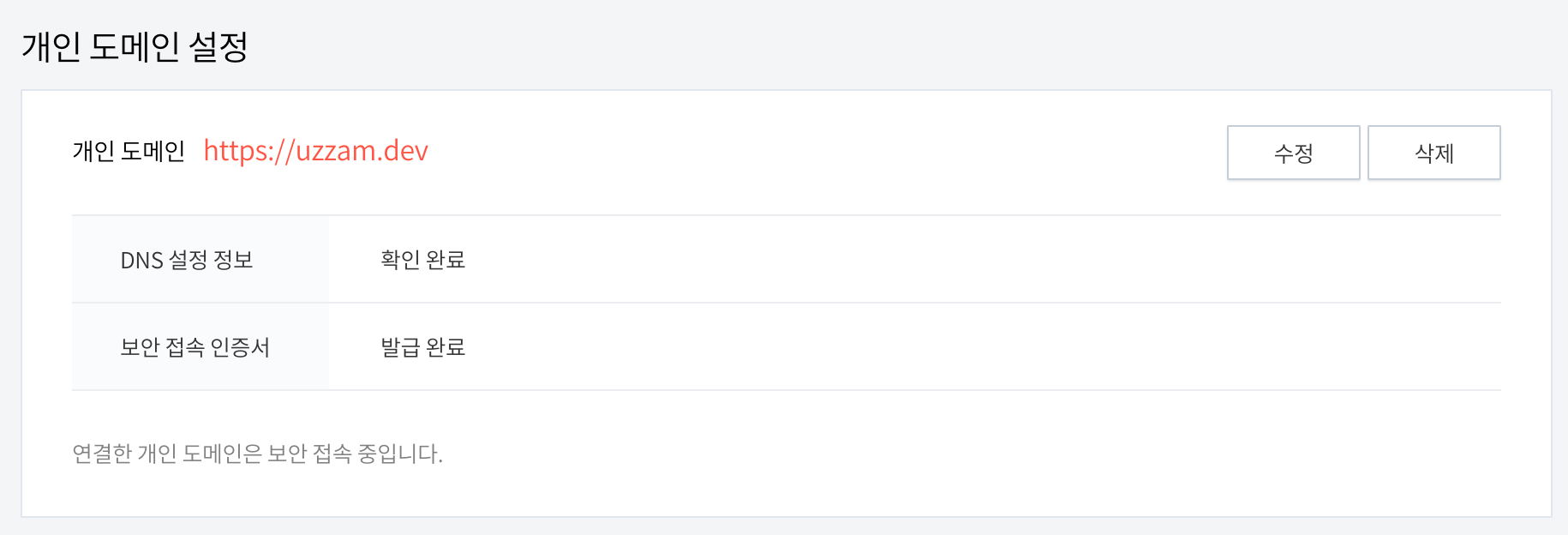 4. 끝이다. 엄청 간단하다. DNS 설정 정보가 확인되면 보안 접속 인증서는 티스토리에서 자동으로 발급받아 준다.